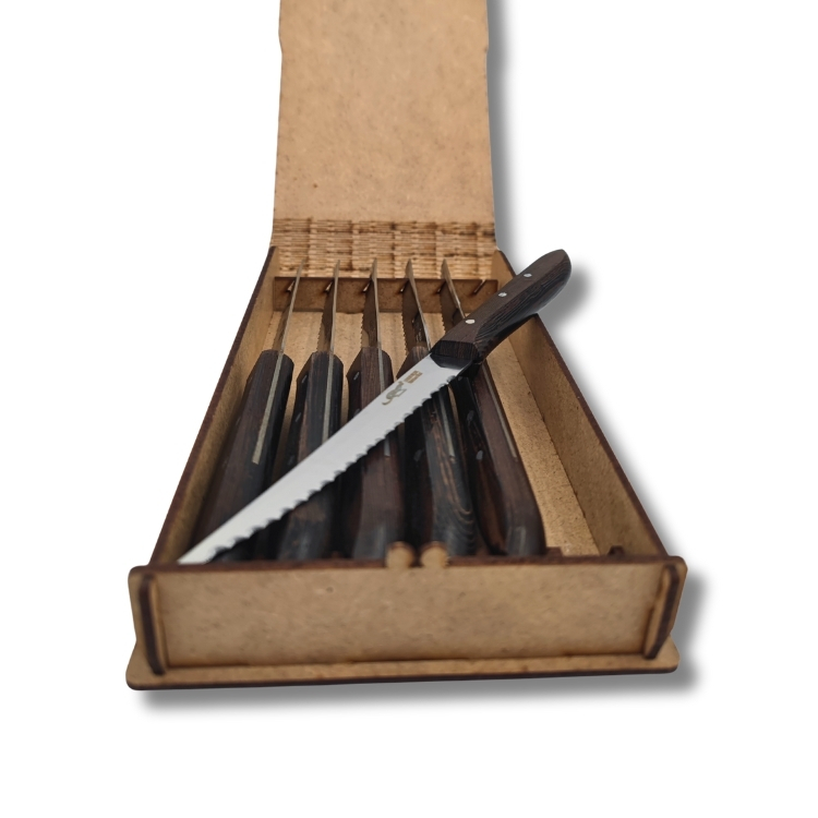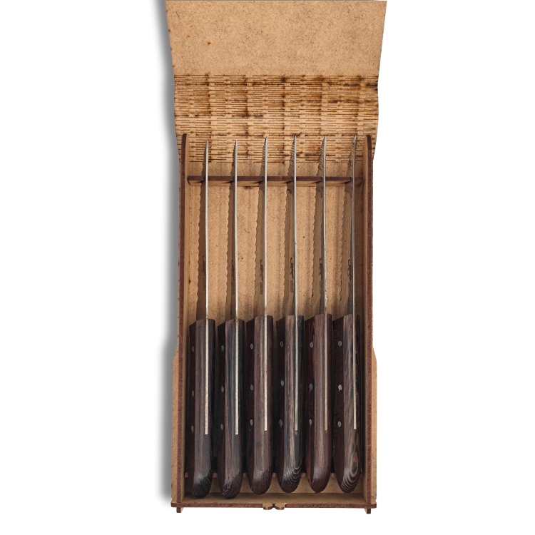 Son derece Şık Kutusunda Steak Bıçak setimizle Sofranızda et ürünlerini dilimlemek keyfe dönüşecek. Aynı zamanda çok amaçlı kullanım imkanı olan bu bıçaklarımız ile et dışında meyve sebze doğrama dilimleme gibi mutfağınızda her işinizde rahatlıkla kullanabileceğiniz çok keskin uzun süre bileme gerektirmeyen bu bıçaklarımız en büyük yardımcınız olacaktır.